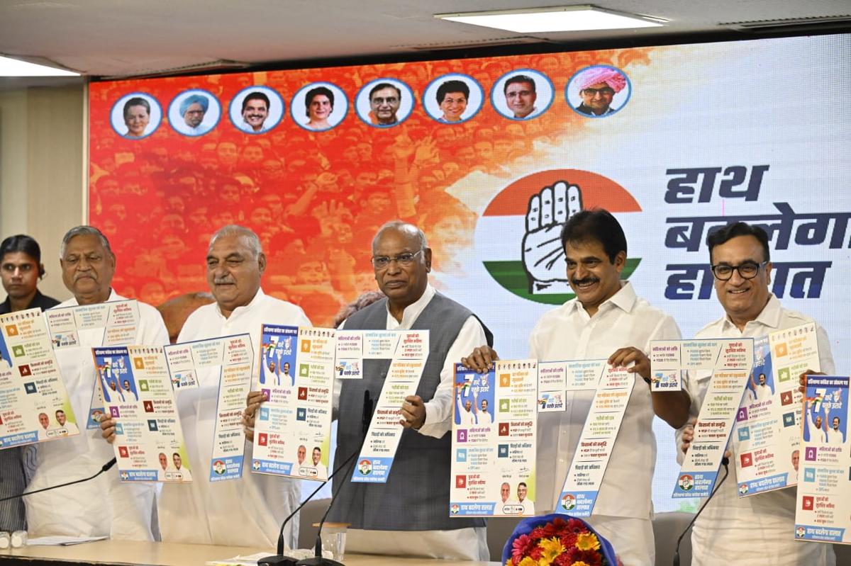 हरियाणा विधानसभा चुनाव से पहले, कांग्रेस ने बुधवार (18 सितंबर 2024) को 7 गारंटियों की घोषणा की है, जिसमें न्यूनतम समर्थन मूल्य (एमएसपी) की कानूनी गारंटी और जाति सर्वेक्षण जैसे बड़े वादे शामिल हैं। कांग्रेस अध्यक्ष मल्लिकार्जुन खरगे ने कहा, “हम इन गारंटियों को लागू करेंगे, इसलिए इसे ‘सात वादे, पक्के इरादे’ नाम दिया गया है।”