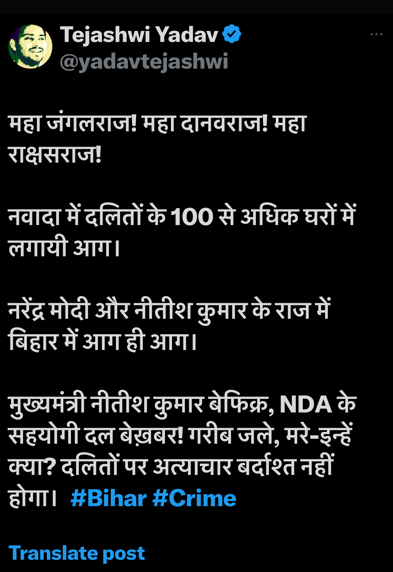बिहार के नवादा जिले में दलितों के घरों में आगजनी की घटना को लेकर राज्य की राजनीति गर्मा गई है। विपक्ष के नेता तेजस्वी यादव ने इस घटना को लेकर एनडीए सरकार और मुख्यमंत्री नीतीश कुमार पर तीखा हमला बोला है। तेजस्वी यादव ने ट्विटर पर एक जोरदार बयान देते हुए राज्य की कानून-व्यवस्था पर सवाल खड़े किए और इसे “महा जंगलराज” करार दिया।