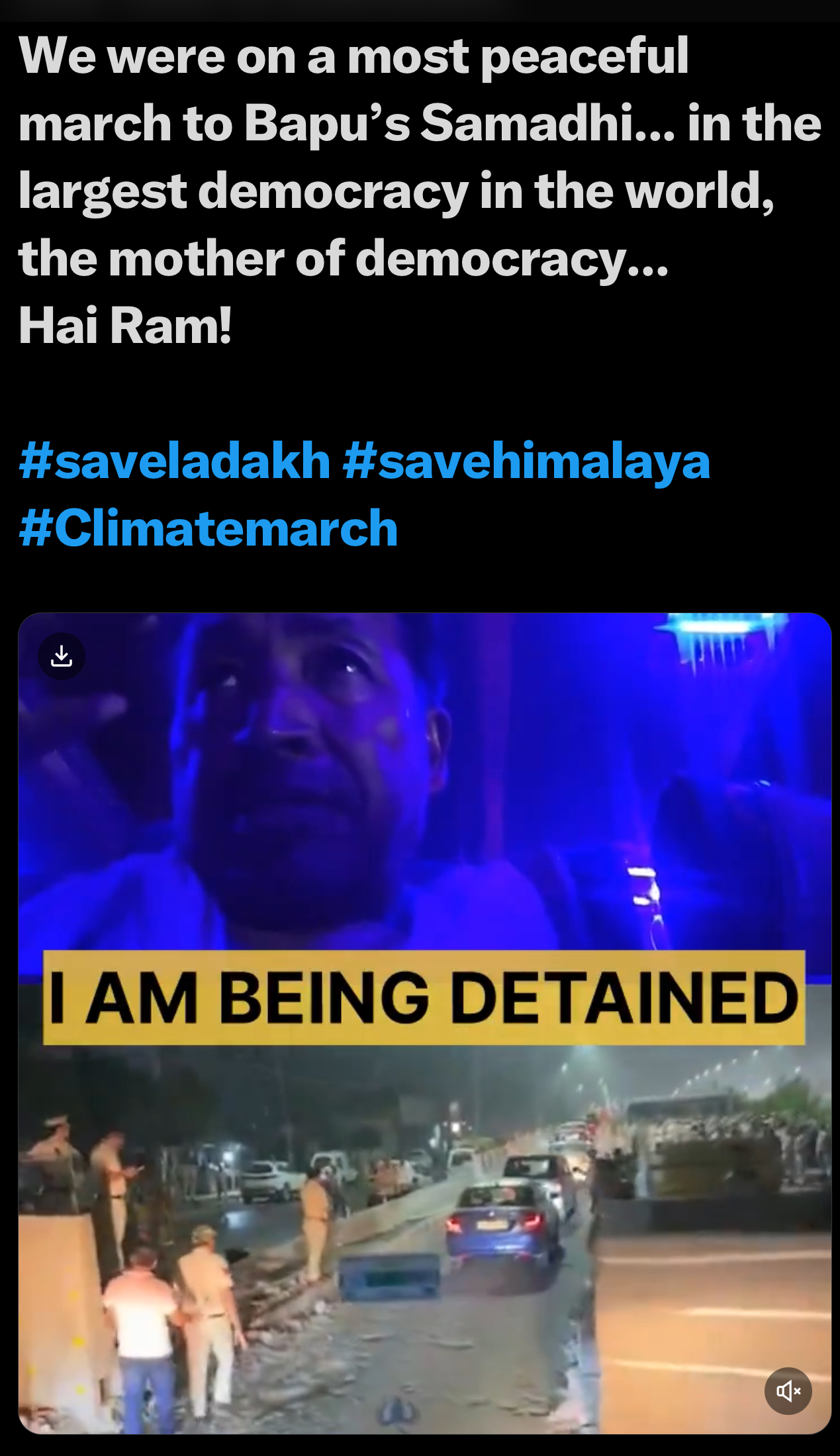 लद्दाख के पर्यावरणविद् और सामाजिक कार्यकर्ता सोनम वांगचुक ने X (पूर्व में ट्विटर) पर जानकारी दी कि उन्हें और उनके साथ 150 पदयात्रियों को दिल्ली बॉर्डर पर पुलिस ने हिरासत में ले लिया है। वांगचुक के अनुसार, उन्हें एक बड़ी पुलिस फोर्स द्वारा रोका गया, जिसमें सैकड़ों पुलिसकर्मी शामिल थे, कुछ रिपोर्ट्स के अनुसार संख्या 1,000 तक थी।