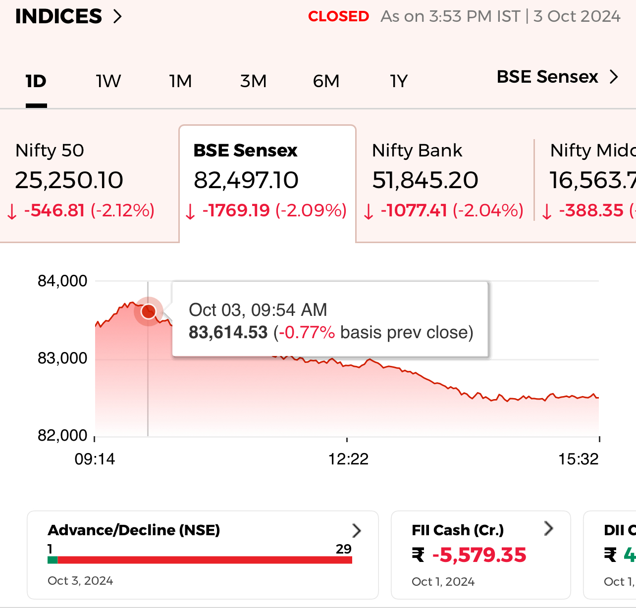 गुरुवार को भारतीय शेयर बाजारों में भारी गिरावट देखी गई, जहां सेंसेक्स 1,800 से अधिक अंक गिर गया और निफ्टी 50 ने 25,250 के स्तर से नीचे फिसलकर निवेशकों के बीच चिंता बढ़ा दी। सेंसेक्स 1,811 अंक यानी 2.15% की गिरावट के साथ 82,455.08 पर आ गया, जबकि निफ्टी 554 अंक गिरकर 25,242 पर बंद हुआ। बीएसई में सूचीबद्ध सभी कंपनियों का बाजार पूंजीकरण 10.56 लाख करोड़ रुपये घटकर 464.3 लाख करोड़ रुपये रह गया।