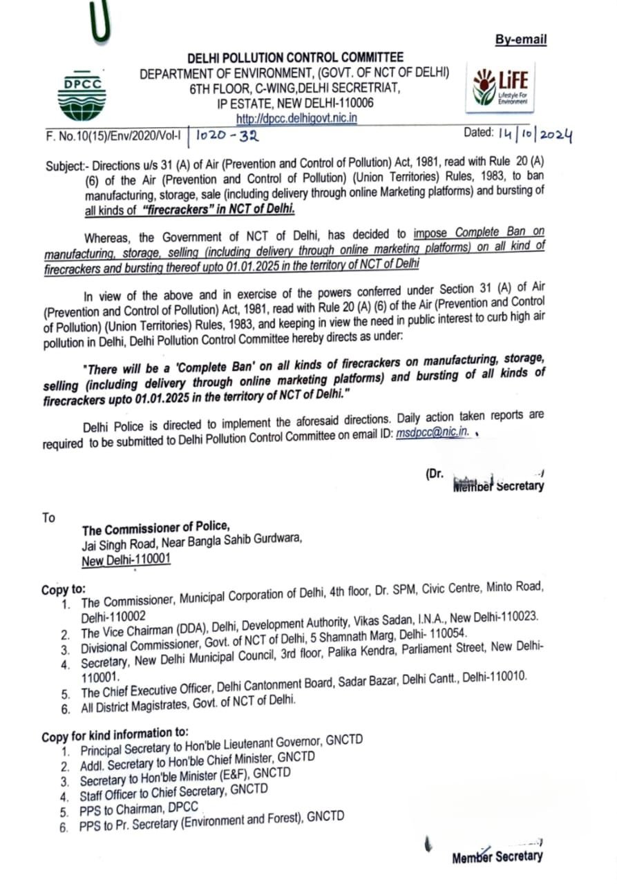 नई दिल्ली: दिल्ली प्रदूषण नियंत्रण समिति (DPCC) ने राष्ट्रीय राजधानी क्षेत्र (NCT) में 1 जनवरी 2025 तक सभी प्रकार के पटाखों के निर्माण, भंडारण, बिक्री, और ऑनलाइन माध्यमों से वितरण और पटाखे फोड़ने पर पूर्ण प्रतिबंध का आदेश जारी किया है। इस आदेश का उद्देश्य दिल्ली में बढ़ते प्रदूषण के स्तर को नियंत्रित करना है, विशेषकर दिवाली और सर्दियों के दौरान जब वायु गुणवत्ता गंभीर रूप से खराब हो जाती है।