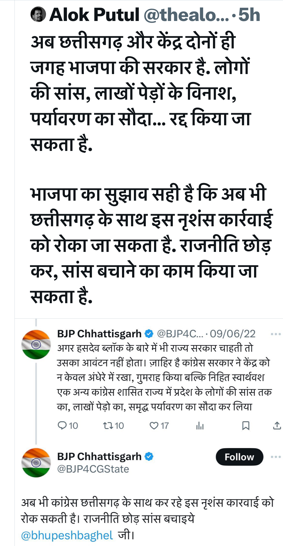 हाल ही में पत्रकार आलोक पुतुल ने सोशल मीडिया पर हसदेव अरण्य के विनाश और पर्यावरण संकट पर गंभीर चिंता व्यक्त की। उन्होंने अपने पोस्ट में कहा कि अब छत्तीसगढ़ और केंद्र में दोनों ही जगह भाजपा की सरकार है, इसलिए इस विनाशकारी कार्रवाई को रोका जा सकता है। उन्होंने खास तौर से पेड़ों की कटाई, पर्यावरण के नुकसान और लाखों लोगों की सांसों के खतरे को उजागर किया। पुतुल ने भाजपा के पुराने पोस्ट का हवाला देते हुए सुझाव दिया कि पार्टी का यह कहना सही है कि अभी भी समय है कि राजनीति को छोड़कर पर्यावरण और लोगों की ज़िंदगी को बचाने के लिए ठोस कदम उठाए जा सकते हैं।
