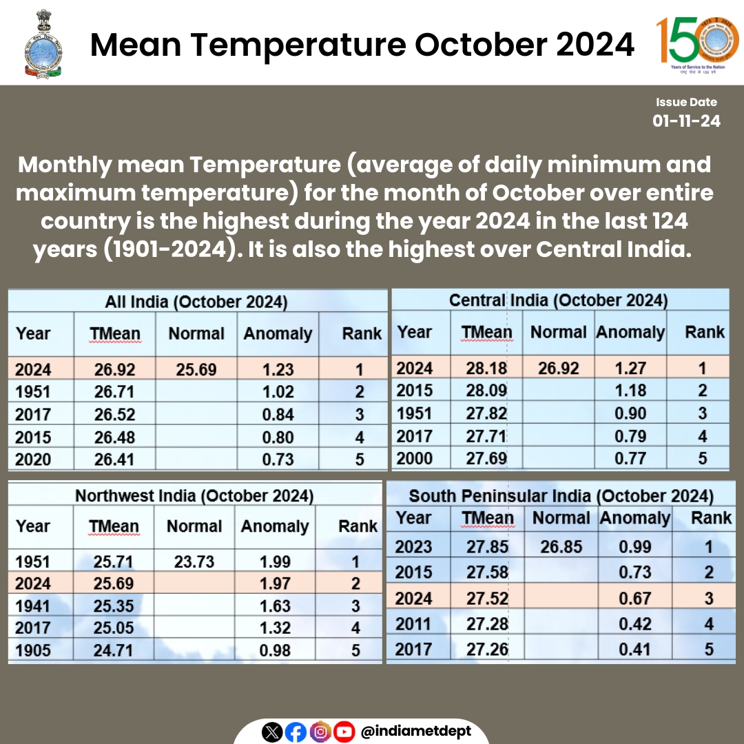 भारतीय मौसम विभाग (IMD) की रिपोर्ट के अनुसार, वर्ष 2024 में अक्टूबर का मासिक औसत तापमान (रोजाना के न्यूनतम और अधिकतम तापमान का औसत) पिछले 124 वर्षों में सबसे अधिक दर्ज किया गया है। इस दौरान केंद्रीय भारत का तापमान भी रिकॉर्ड स्तर पर रहा। IMD के मुताबिक, 1901 से अब तक किसी भी वर्ष में अक्टूबर के महीने में इतना अधिक औसत तापमान दर्ज नहीं किया गया था।