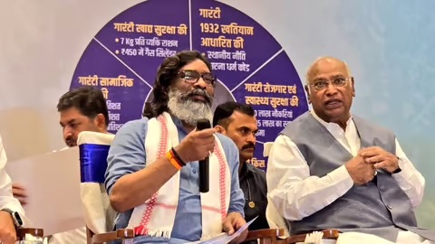 रांची: झारखंड विधानसभा चुनाव के लिए मुख्यमंत्री हेमंत सोरेन, कांग्रेस अध्यक्ष मल्लिकार्जुन खड़गे और अन्य INDIA गठबंधन के नेताओं ने मंगलवार को संयुक्त घोषणापत्र ‘न्याय पत्र’ जारी किया। इस घोषणापत्र में झारखंड के नागरिकों के लिए सात प्रमुख गारंटी देने का वादा किया गया है, जिनमें 10 लाख रोजगार, गरीबों के लिए 15 लाख रुपये तक का स्वास्थ्य बीमा और महिलाओं के लिए सम्मान योजना के तहत 2500 रुपये प्रति माह की राशि शामिल है।