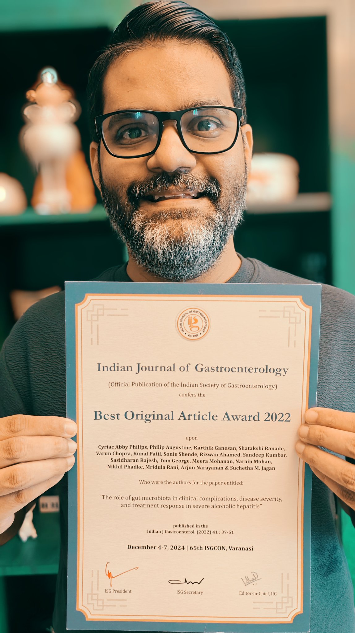 भारतीय गैस्ट्रोएंट्रोलॉजी सोसाइटी (ISG) और इंडियन जर्नल ऑफ गैस्ट्रोएंट्रोलॉजी (IJG) ने 2024 का नेशनल प्राइज – बेस्ट पेपर अवार्ड डॉ. एबी फिलिप्स को उनके शोध के लिए प्रदान किया। यह पुरस्कार उनके 2022 में प्रकाशित शोध पत्र के लिए दिया गया, जिसमें गट माइक्रोबायोम और गंभीर अल्कोहल-एसोसिएटेड हेपेटाइटिस के रोगियों में होने वाली क्लीनिकल घटनाओं के बीच संबंध का अध्ययन किया गया था।