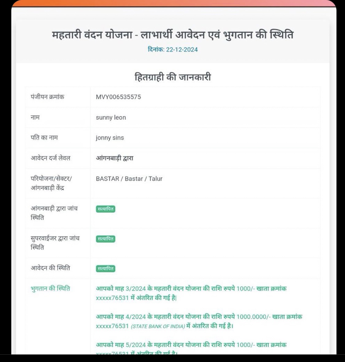 बस्तर जिले के ग्राम तालुर में महतारी वंदना योजना में अनियमितता का सनसनीखेज मामला सामने आया है। इस योजना के तहत सन्नी लियोन के नाम पर राशि का भुगतान किए जाने की घटना ने सभी को चौंका दिया है।