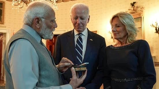 अमेरिकी राष्ट्रपति जो बाइडेन और उनके परिवार को 2023 में विदेशी नेताओं से लाखों डॉलर मूल्य के उपहार मिले। इनमें सबसे महंगा उपहार प्रथम महिला जिल बाइडेन को भारतीय प्रधानमंत्री नरेंद्र मोदी द्वारा दिया गया था। यह 7.5 कैरेट का हीरा लगभग ₹1.65 करोड़ (20,000 डॉलर) मूल्य का था।