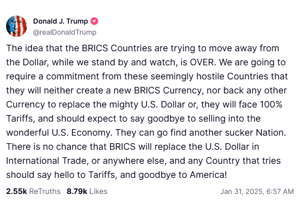 अमेरिकी राष्ट्रपति डोनाल्ड जे. ट्रंप ने हाल ही में एक बयान में BRICS देशों को चेतावनी दी है कि यदि वे अमेरिकी डॉलर के स्थान पर किसी नई मुद्रा का सृजन या समर्थन करते हैं, तो उन्हें 100% टैरिफ का सामना करना पड़ेगा। उन्होंने कहा, “BRICS देशों द्वारा डॉलर से हटने का विचार अब समाप्त हो चुका है। हम इन देशों से प्रतिबद्धता की मांग करेंगे कि वे न तो नई BRICS मुद्रा बनाएंगे, न ही किसी अन्य मुद्रा का समर्थन करेंगे, अन्यथा उन्हें 100% टैरिफ का सामना करना पड़ेगा और अमेरिकी अर्थव्यवस्था में व्यापार करने से वंचित होना पड़ेगा।”