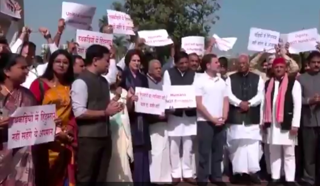विपक्ष ने भारतीयों के प्रत्यारोपण के दौरान अमेरिका द्वारा किये गये अमानवीय व्यवहार के मुद्दे को लेकर संसद का घेराव किया