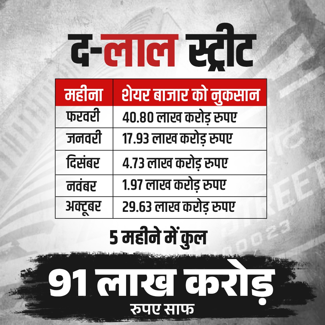 पिछले पांच महीनों से भारतीय शेयर बाजार में लगातार गिरावट जारी है, जिससे निवेशकों को भारी नुकसान का सामना करना पड़ा है। अक्टूबर 2024 से फरवरी 2025 तक, बीएसई (बॉम्बे स्टॉक एक्सचेंज) में सूचीबद्ध कंपनियों के बाजार पूंजीकरण में लगभग ₹91 लाख करोड़ की कमी आई है।