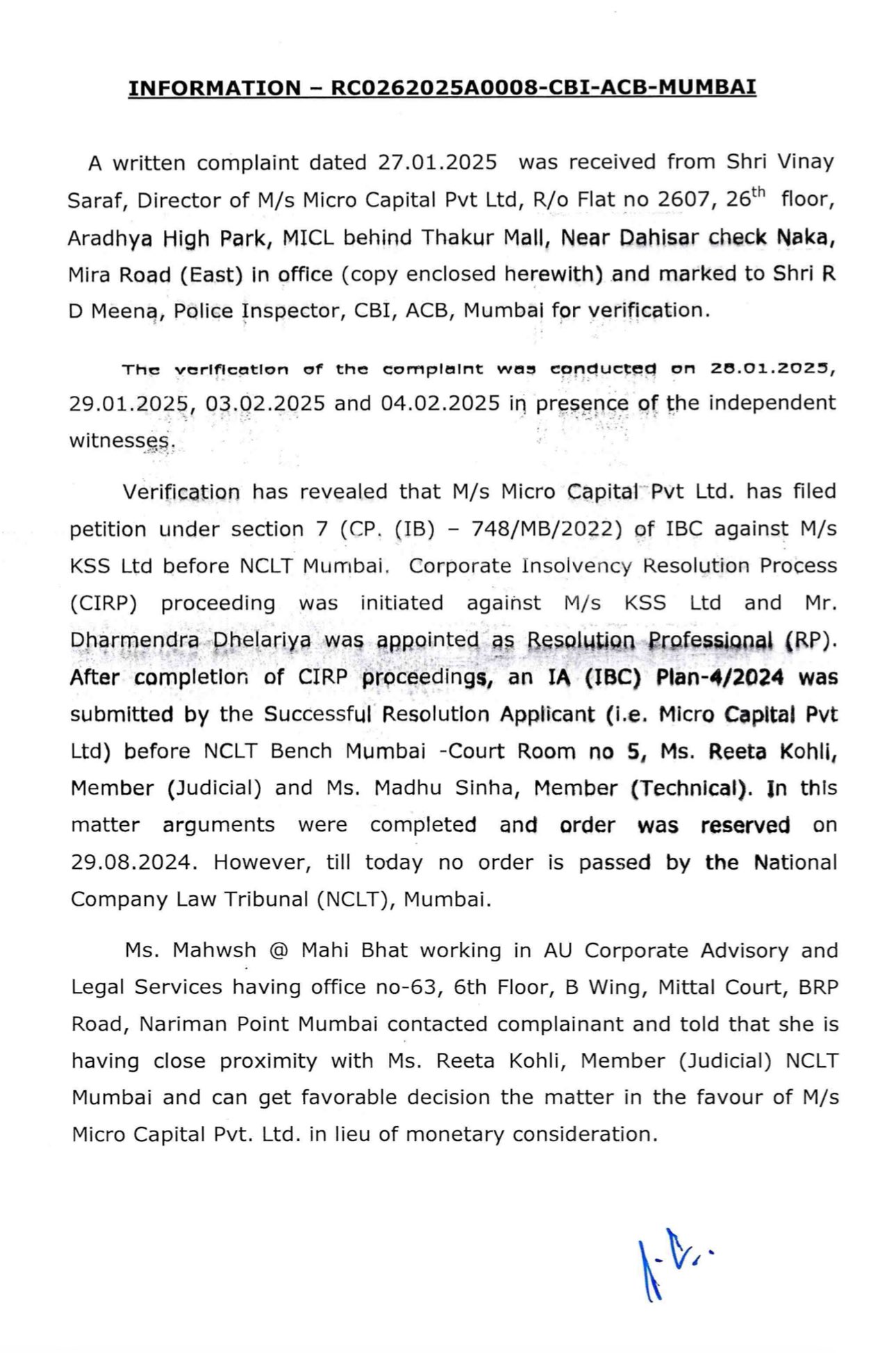 फरवरी 2025 में, केंद्रीय जांच ब्यूरो (सीबीआई) ने मुंबई में राष्ट्रीय कंपनी विधि न्यायाधिकरण (एनसीएलटी) की पीठों को प्रभावित करने के आरोप में दो निजी व्यक्तियों के खिलाफ मामला दर्ज किया है। सूत्रों के अनुसार, दिवाला कार्यवाही में अनुकूल आदेश प्राप्त करने के लिए 1.5 करोड़ रुपये की राशि ली जाती थी।