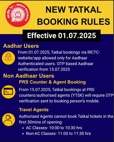 रेल मंत्रालय ने घोषणा की है कि तत्काल टिकट बुकिंग के लिए अब आधार आधारित प्रमाणीकरण और OTP सत्यापन अनिवार्य कर दिया गया है। यानी यात्री को बुकिंग के समय अपने आधार नंबर को सत्यापित करना होगा और मोबाइल पर प्राप्त OTP दर्ज करना होगा।