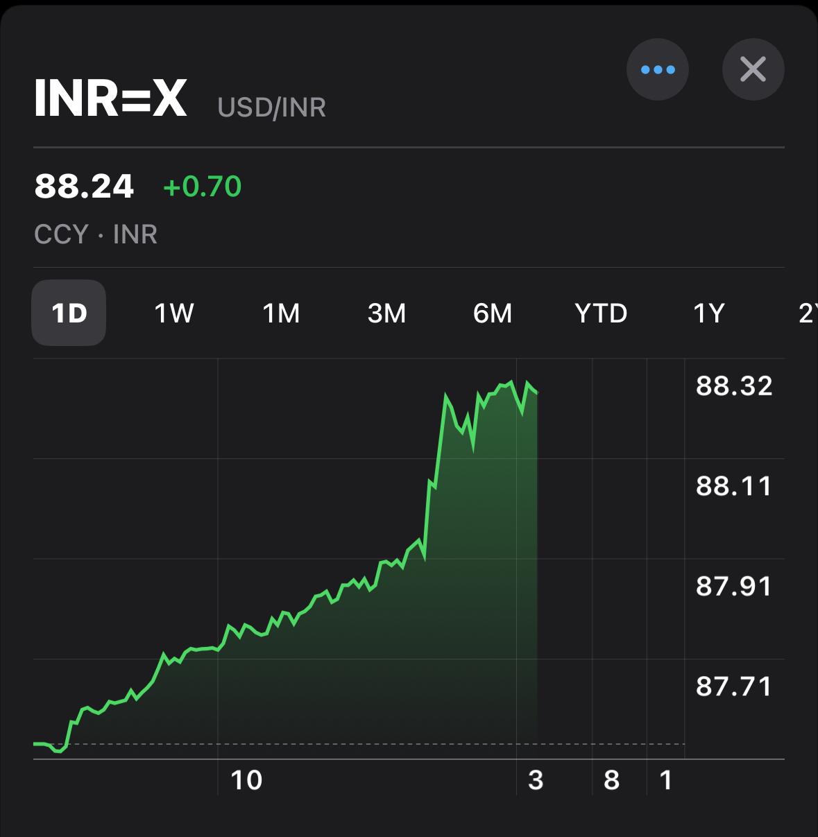 29 अगस्त 2025 को भारतीय रुपया अमेरिकी डॉलर के मुकाबले अब तक के सबसे निचले स्तर पर पहुँच गया और ₹88 प्रति डॉलर की सीमा पार कर गया। यह पहली बार है जब रुपया इस स्तर तक गिरा है।