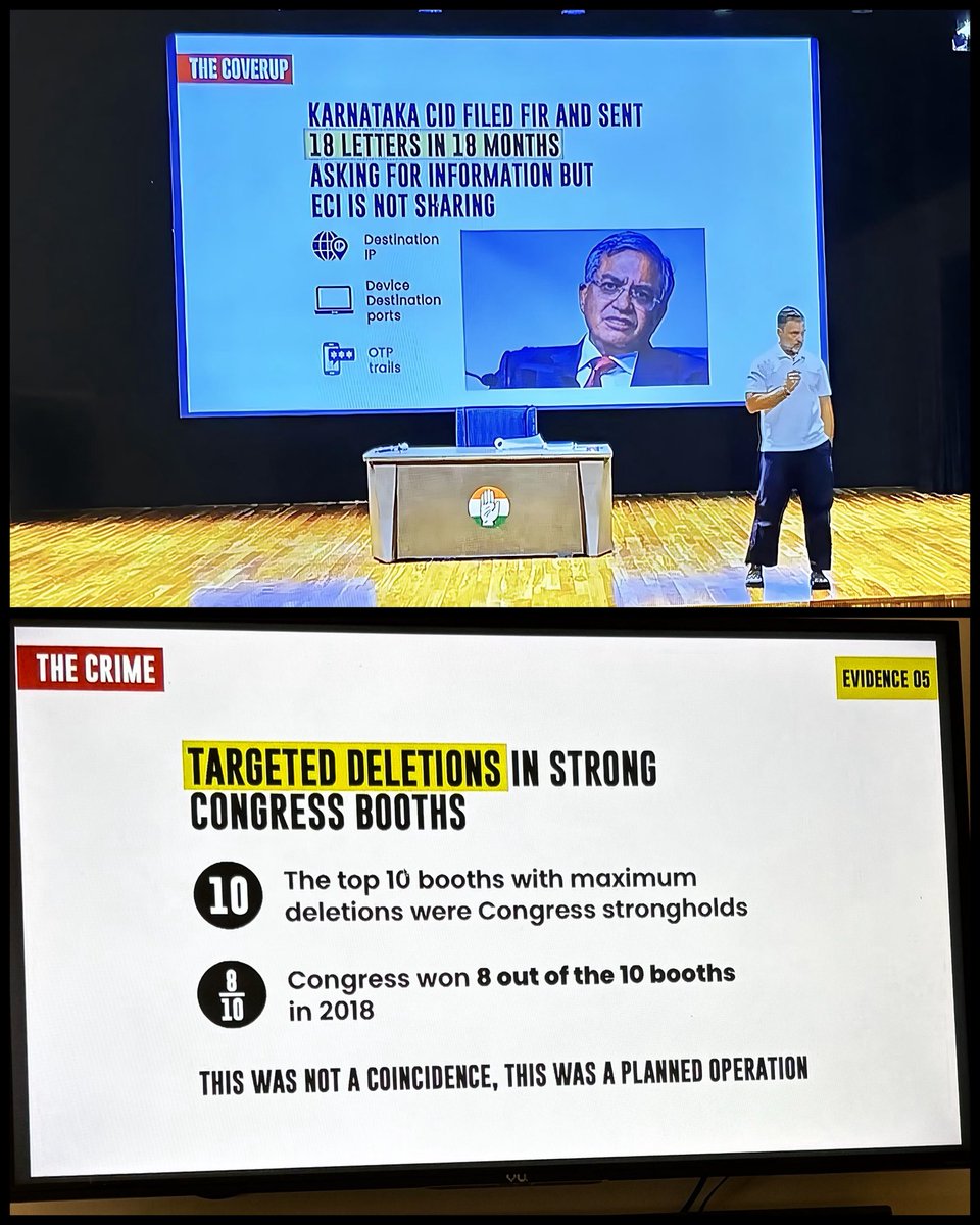राहुल गांधी ने कहा कि पिछले 18 महीनों में कर्नाटक CID ने चुनाव आयोग को कुल 18 पत्र भेजे हैं, जिनमें पूछा गया है कि IP एड्रैस कहाँ से आ रहे हैं, कौन से OTP ट्रेल हैं, कि deletion forms या आवेदन कहां से भरे जा रहे हैं।
