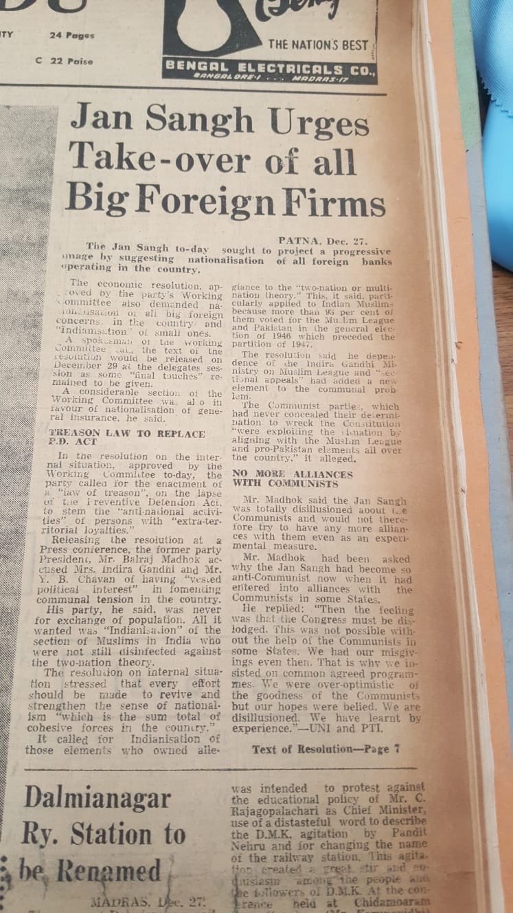 जन संघ ने इंदिरा सरकार से विदेशी बैंकों का राष्ट्रीयकरण करने की मांग करते हुए उस समय के प्रकाशित ख़बर