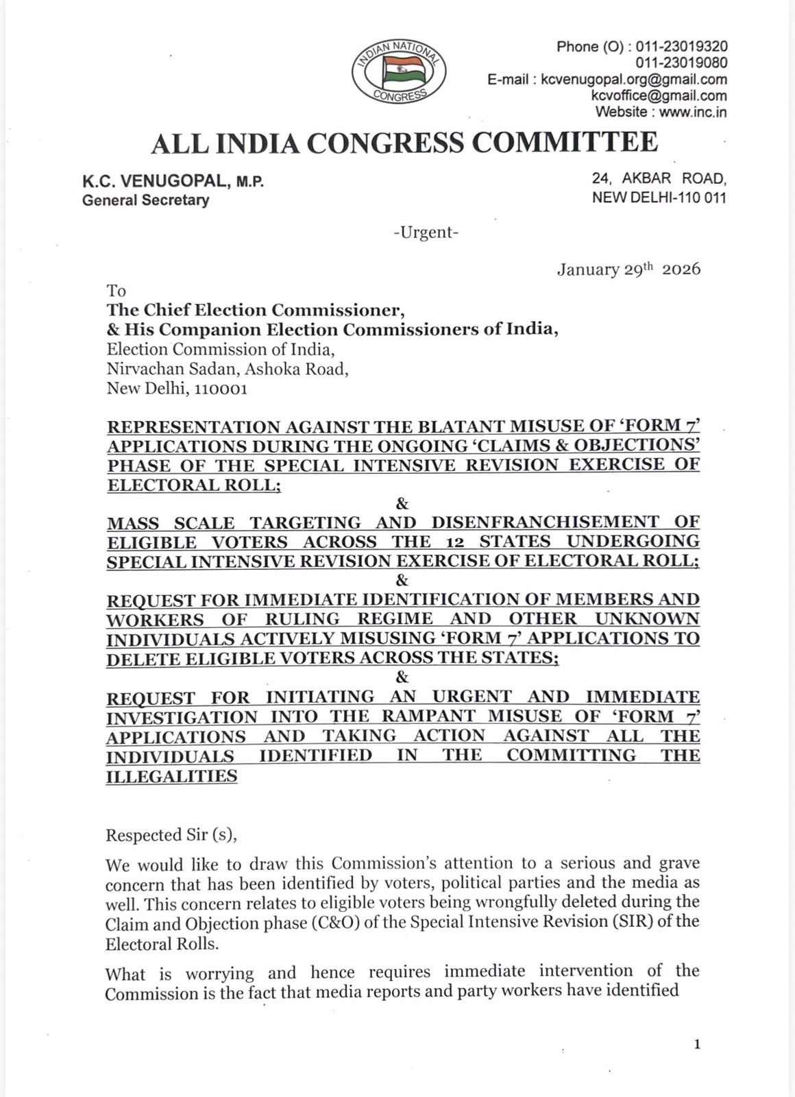 कांग्रेस ने विशेष गहन पुनरीक्षण (एसआईआर) प्रक्रिया के दौरान मतदाता सूची से बड़े पैमाने पर नाम विलोपित किए जाने के आरोपों को लेकर निर्वाचन आयोग (ईसीआई) को पत्र लिखकर कड़ा रुख अपनाया है। पार्टी ने संविधान के अनुच्छेद 324 का हवाला देते हुए फॉर्म क्रमांक-7 के कथित दुरुपयोग और मताधिकार पर हो रहे प्रहार की निष्पक्ष जांच कराने की मांग की है।